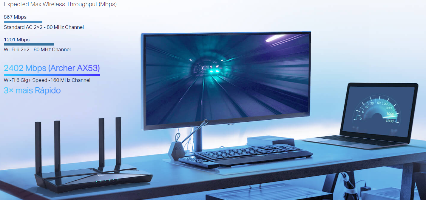 Não há razão para adiar a compra de um router Wi-Fi 6 quando já pode tirar o máximo partido da velocidade que oferece. Com uma largura de banda de 160 MHz e 1024-QAM, o Archer AX53 proporciona verdadeiras velocidades Gigabit de até 3 Gbps. Desfrute de streaming e jogos mais rápidos como nunca antes. Alimentado por uma poderosa CPU dual-core, este router Gigabit Wi-Fi 6 completo permite que várias tarefas intensivas de largura de banda sejam executadas sem problemas ao mesmo tempo.