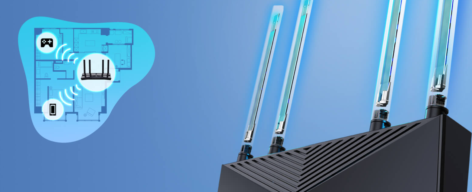 Quatro antenas externas de elevado ganho e a tecnologia Beamforming combinam-se para estender uma rede WiFi forte e fiável a toda a casa.